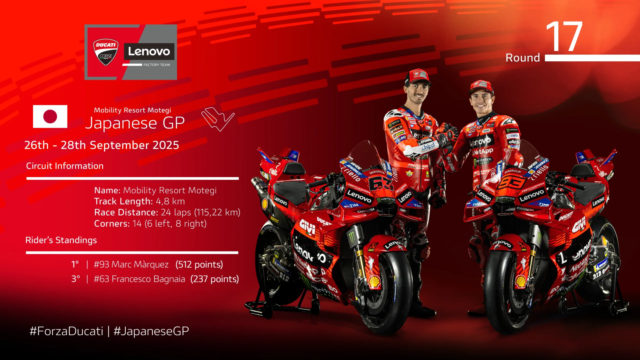 En el calendario de MotoGP, hay paradas que pesan más que otras. Motegi es una de ellas. No solo porque el trazado japonés se ha convertido en una sede fija desde 2004, sino porque siempre ha sido un circuito de verdades. Allí donde los motores se exprimen en las rectas interminables y los frenos se ponen al límite antes de cada horquilla, es donde Ducati afronta este fin de semana dos narrativas paralelas: el primer “match ball” de Marc Márquez para conquistar el título, y la búsqueda de un Francesco Bagnaia que necesita reencontrarse con su mejor versión.